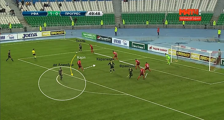 Салатич побежал далеко вперёд, когда "Уфа" попыталась начать новую атаку, но Живоглядов попал в соперника, и "Прогрес" провёл опасную атаку. Пятёрка защитников уфимцев выстроилась в линию в своей штрафной, а Карп побежал накрывать Карапетяна, и на линии штрафной остаётся только де Алмейда. Его удар был заблокирован защитником
