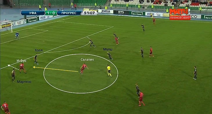 А здесь Салатич выдаёт передачу на ход Игбуну. Обработать пас сразу не получилось, но именно после этого Игбун разобрался 1 в 1 с Холлом и (неточно) пробил в ближний угол
