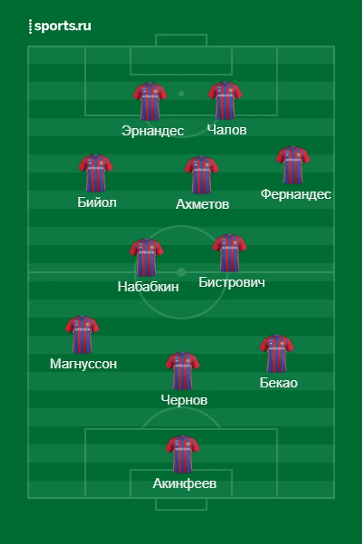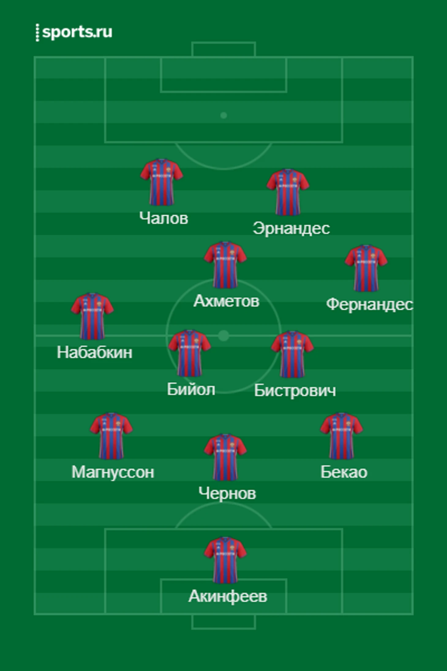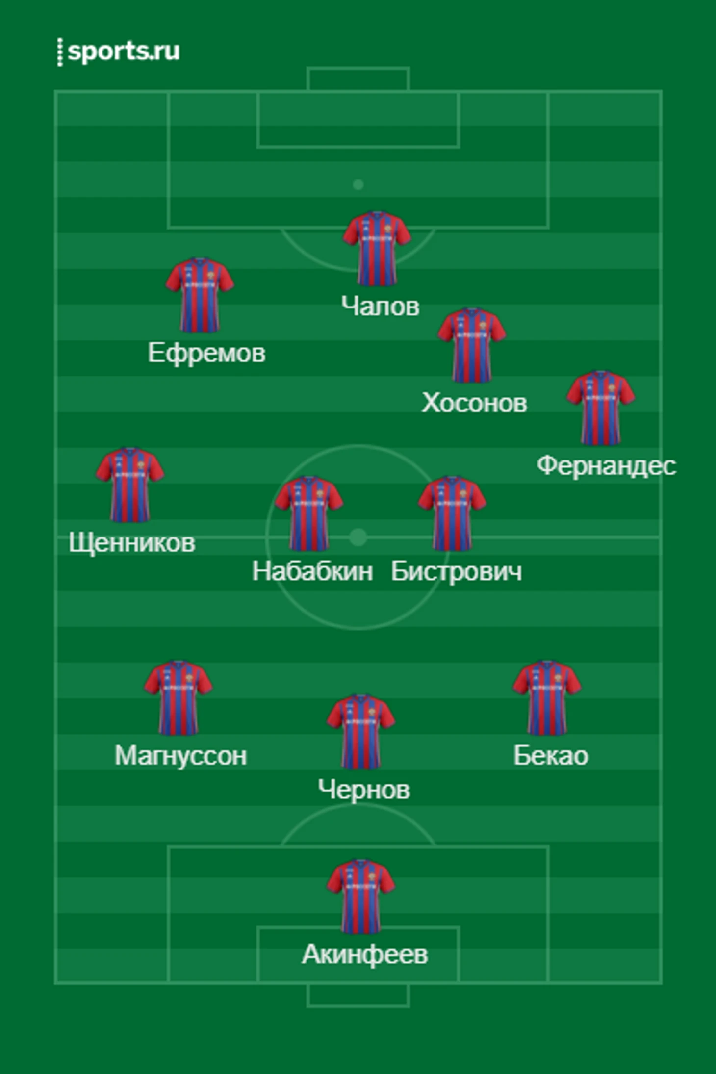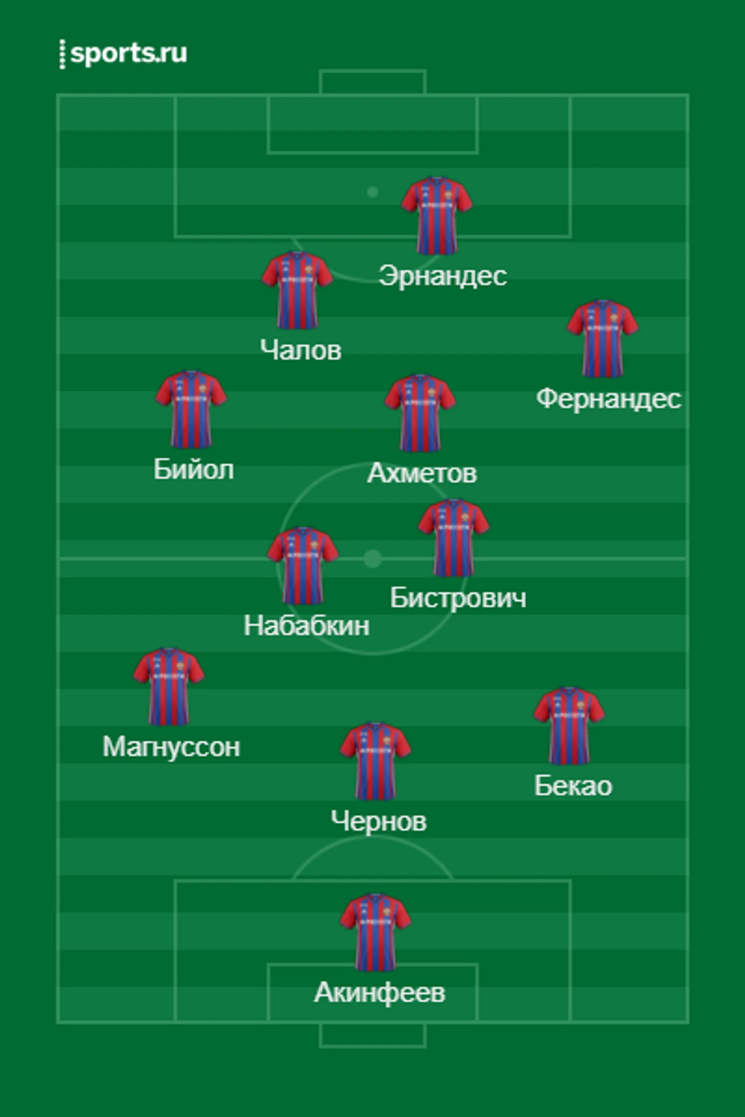 Всё, что написано выше теория, пока она не применяется на поле. Поэтому необходимо отталкиваться от тех игроков, которые есть сейчас в распоряжении ВМГ. Список игроков, которые находятся в заявке на матч с Енисеем и, скорее всего, останутся в ней в матчах против Арсенала, Рубина и Урала: Акинфеев, Помазун, Набабкин, Щенников, Фернандес, Чернов, Магнуссон, Бекао, Бистрович, Ефремов, Бийол, Гордюшенко, Ахметов, Эрнандес, Жамалетдинов, Чалов и Жиронкин. Стартовый состав ясно просматривается.