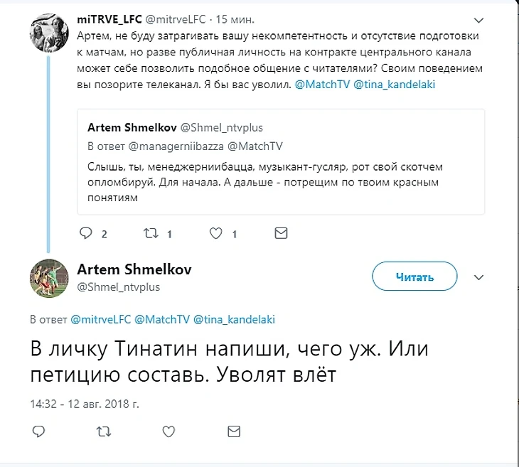 Самое интересное во всём этом, что Артём начал отвечать всем его критикующим в грубой форме, что может свидетельствовать о потере им контроля над своими действиям. В твитах можно усмотреть и намеки на разжигание межнациональной розни. Наслаждайтесь: перед вами один из ведущих комментаторов Матч! ТВ.