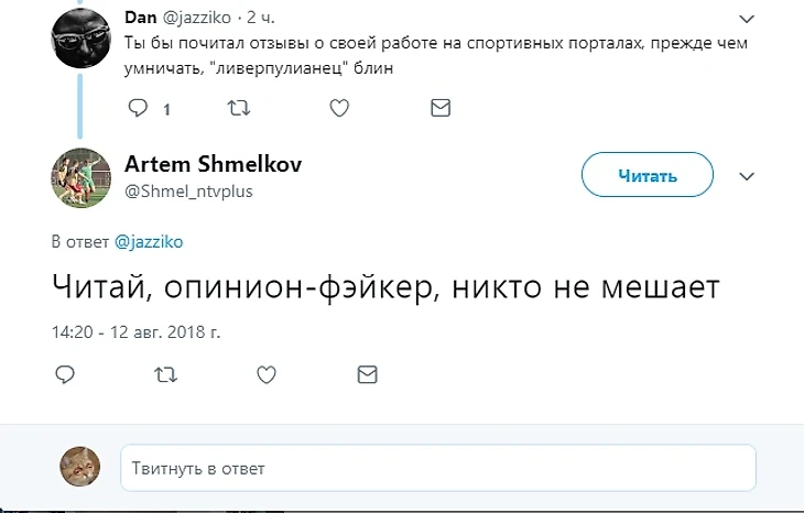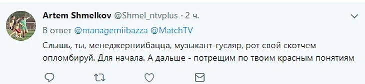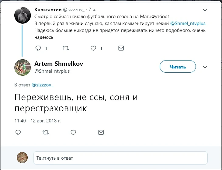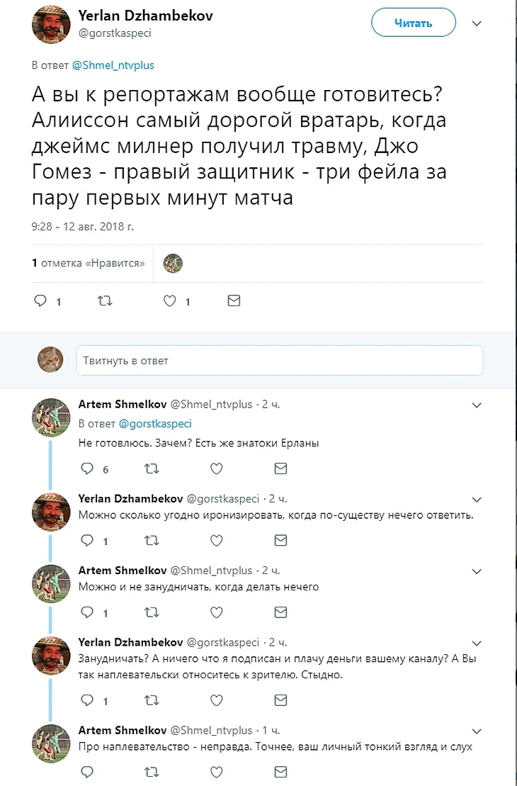 Ситуация усугубилась тем, что после матча Шмельков начал неадекватно отвечать в своём Twitter людям, которые были возмущены таким некачественным репортажем, с постоянными непонятными фактами, сравнениями с полностью противоположными видами спорта, на платном телеканале. Кто смотрел игру в прямом эфире, тот поймет. Далее приведём лишь один из примеров, в конце поста будет целая подборка.