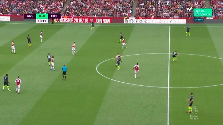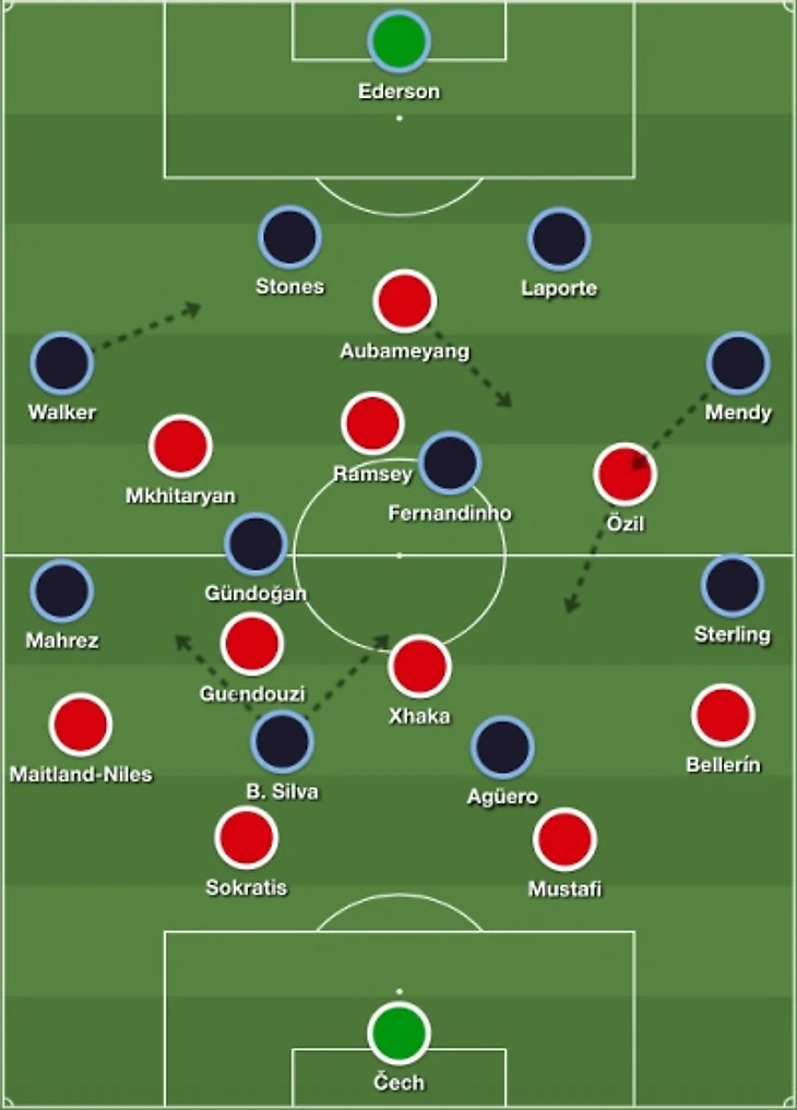 Арсеналу удалось сохранить контроль над мячом за неплохой хороший период игры, где мы увидели оборонительную форму Манчестер Сити 4-4-2. Предположительно, это было с намерением опекать почти каждого футболиста против 4-2-3-1 Эмери. Фернандиньо и Гюндоган были двойным стержнем, который должен был давить на пару Джака-Гендузи, когда они получали мяч. И, как способ предотвратить пасы в стороны широко играющих атакующих игроков (Озил и Мхитарян), соответствующие фулбэки (Менди и Уокер) будут прессинговать их, когда мяч будет у одного из них.