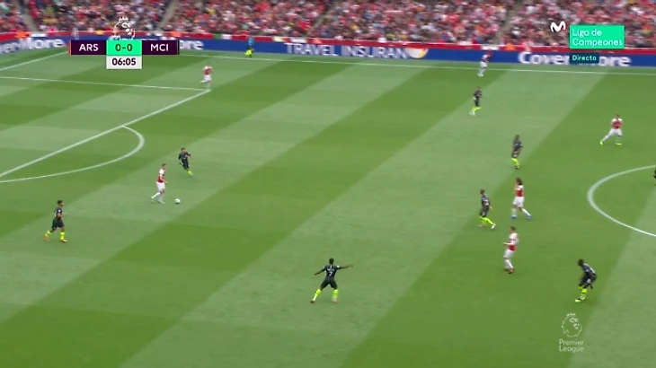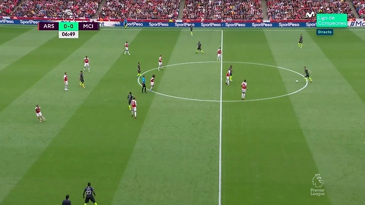 Кайл Уокер был дополнительным человеком, который оставлял свой фланг и становился третьим ЦЗ, как и в сборной Англии, однако более интересным аспектом этой схемы было то, что он увидел, что Бенджамин Менди переместился с левой стороны в центр полузащиты. Когда игра переместилась справа налево, Менди сделал ход в центр - к слепой зоне соседнего полузащитника. Это было попыткой создать правильный позиционный баланс структурно, а также сузить игроков полузащиты Арсенала и предоставить больше времени и пространства для Стерлинга, который в основном на протяжении всего матча занимал позицию латераля.
