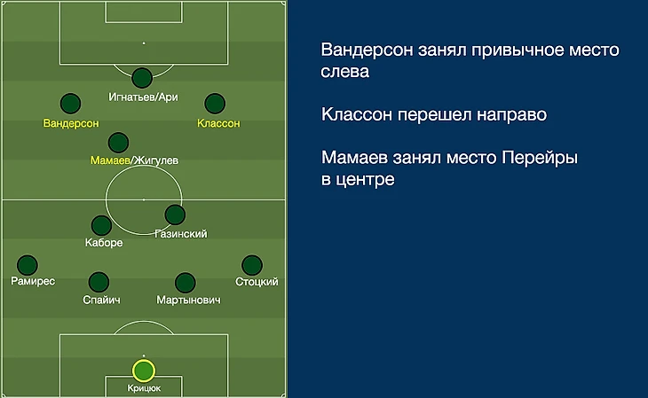 Мамаев, играя «Перейру», произвел двойственное впечатление. Иногда тормозил атаку, предпочитая безопасную передачу пасу вразрез. К 70-й минуте «наелся». Его замена не вызывает вопросов.