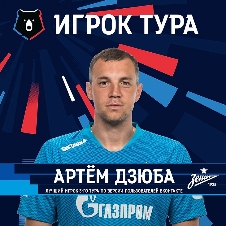 Форвард Зенита Артём Дзюба признан народом лучшим игроком 3-го тура Российской Премьер Лиги. В матче против Рубина, Артём отдал голевую передачу на Александра Ерохина.