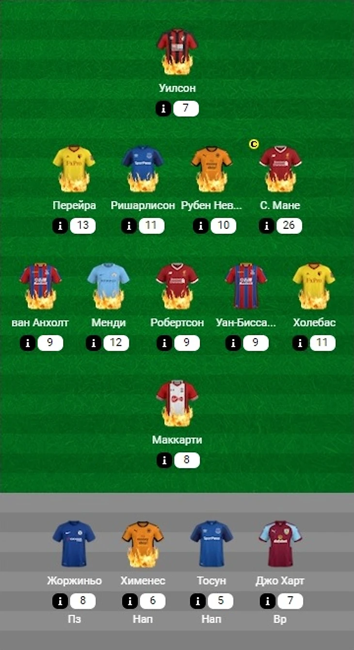 Стоимость команды соблюдена, она ровно 100. О том, что лимит игроков из одной команды здесь не 2, а 3 я писал выше. Если закрыть глаза на бюджет, то на лавку я бы усадил Ришарлисон 7,5 Эвертон, Мохамед Салах 9,5 Ливерпуль, Лейтон Бейнс 6,0 Эвертон и Джо Харт 5,5 Бернли.