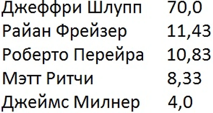 Немного отвлеченной статистики: я решил ввести своеобразный КПД для фэнтези-игроков, который считается по формуле: кол-во набранных очков/процент выбравших пользователей. Вот, кто оказался в топе, на примере полузащитников: