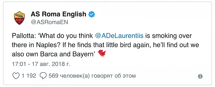 - Что Де Лаурентис курит в своем Неаполе? Если он еще раз пообщается с той маленькой птичкой, то узнает, что мы также владеем "Барселоной" и "Баварией", - цитирует Паллотту официальный Твиттер "Ромы".Если "Рома" и "Ливерпуль" действительно имеют одного владельца, они не имеют права вместе выступать в Лиге чемпионов, поскольку это нарушает правила УЕФА. Оба клуба принадлежат американцам: "Ромой" руководит Джеймс Паллотта, "Ливерпулем" - Джон Генри.
