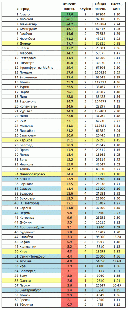 На постсоветском пространстве особенно выделяется Донецк. Отличная арена, отличные результаты клуба и, как следствие, отличная посещаемость. С такими показателями Донецку самое место в Германии. Но есть одно «но»: город Донецк фактически сросся с соседней Макеевкой населением 400-тысяч. От центра Макеевки до «Донбасс-арены» меньше 15 км. Скорее всего, в ближайшее время эти города окончательно объединят, и по коэффициенту посещаемости Донецк окажется в середине таблицы. Но как бы то ни было, «шахтёры» пока лучшие на постсоветском пространстве.