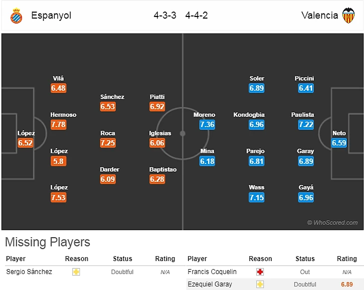 На что обратить внимание: На то, что гости поедут в Каталонию без столпа своей обороны Эзекиля Гарая(6). Зато мышкам пока удалось сохранить в своем составе лидера атаки Родриго Морено(8). Неизвестно дело ли в ценнике который валенсийцы объявили Мадриду или в акции болельщиков, которые всю последнюю тренировку скандировали "Родриго оставайся" - но форвард готовится к матчу с Эспаньолом в составе летучих мышей.