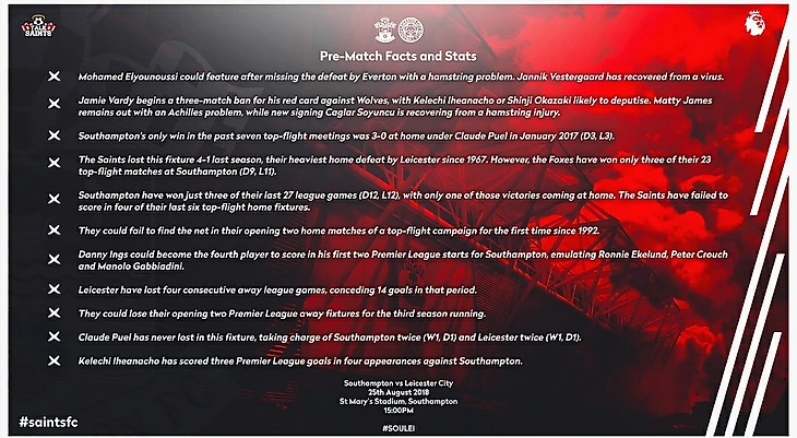 Сегодня в гости к Саутгемптону приезжает Лестер Сити во главе с нашим старым знакомым Клодом Пюэлем. Последний визит Лестера закончился кошмаром для Святых. 1-4 - самое крупное домашнее поражение с 1967 года! Конечно же Саутгемптон жаждет реванша!