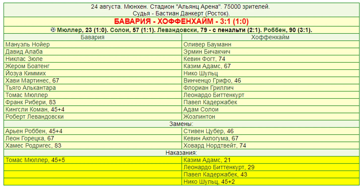 Благо, и потерь в составе мюнхенцев нет. На поле вышел даже Алаба, получивший повреждение в матче за Суперкубок. А вот у «Хоффенхайма» вне игры остались вице-чемпион мира Крамарич, а также Рупп и важнейшие игроки середины поля Амири и Демирбай. Зато в составе нашлось место сразу четырем новичкам: Адамсу, Грифо, Битенкуру и Жоэлинтону. Ранее «Хоффенхайм» разгромил в первом раунде Кубка Германии со счетом 6:1 «Кайзерслаутерн», а вот «Баварии» в том же турнире пришлось повозиться с «Дрохтерсеном» (многие ли знают, кто это?), хоть и играла она основой, но выиграла с минимальным счетом.