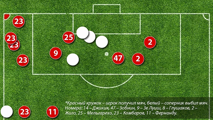 Когда изучаешь "стандарты" в исполнении какой-то команды, важно найти систему. И у "Спартака" она есть. Во-первых, подачи идут на обе штанги, но на ближнюю все-таки чаще – 15 против 13. Еще есть подачи примерно по центру в районе одиннадцатиметровой точки – всего пара эпизодов. И есть розыгрыши, об опасности которых хорошо знают в "Анжи" и "Оренбурге". Хотя второй случай – запутанный: угловой уже был заигран.