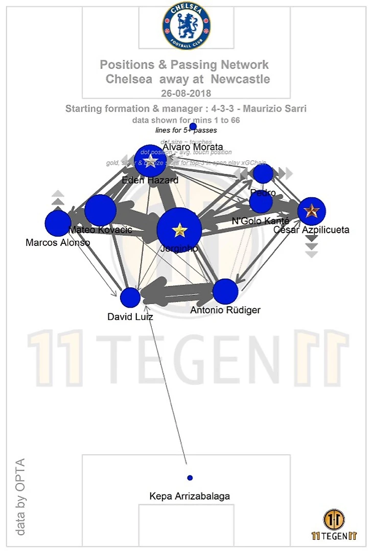 В таком ключе проходил практически весь матч, «синие» пытались вскрыть защитные линии, а «сороки», напротив, дисциплинированно и агрессивно оборонялись. Эден Азар получал много передач и обыгрывал на дриблинге соперников, а игроки «Ньюкасла» постоянно фолили на нем и жестко били по ногам (такой сценарий – давно не новость для болельщиков «синих»). Еще Эден большую часть матча располагался ближе к центру поля, освобождая фланг Маркосу Алонсо и помогал Альваро Морате. Альваро в свою очередь был очень активен, но немного медлительным, именно в те моменты, когда нужно было расстаться с мячом гораздо быстрее. Жоржиньо показал в очередной раз, что он «мозговой центр» нынешнего «Челси», отдав точных передач больше, чем все игроки «Ньюкасла».