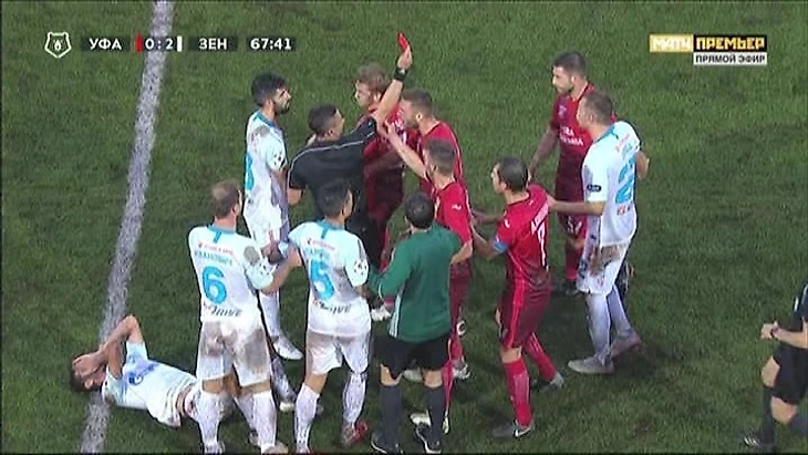На 68 минуте произошел безобразный эпизод с участием Ерохина и Йокича. Последний ударил локтем Александра, и тот остался лежать на газоне. Судья сразу же показал желтую карточку игроку Уфы. Однако Йокичу такое поведение не понравилось и он начал выговаривать Ерохину, видимо полагая, что зенитовец симулирует. Ерохин вскочил и хотел разобраться с обидчиком, однако Йокич зачем то решил включить “режим Зидана” и боднул Ерохина головой в грудь. За что разумеется был справедливо удален. Однако это удаление не помешало Уфе, она продолжала искать свои шансы в атаке, несмотря на то, что осталась вдесятером.