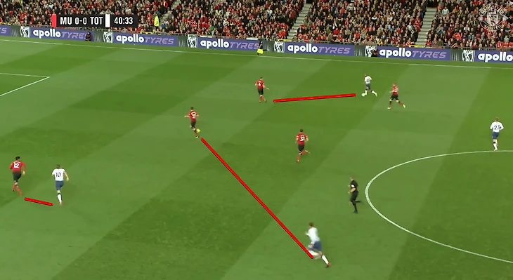 Моуринью явно выделил левый фланг как слабейшее звено обороны «шпор» — Лукаку, Лингард и Фред раз за разом пытались эксплуатировать зону за спиной третьего номера «Тоттенхэма», совершая диагональные забегания и откликаясь на передачи Валенсии и Эрреры.