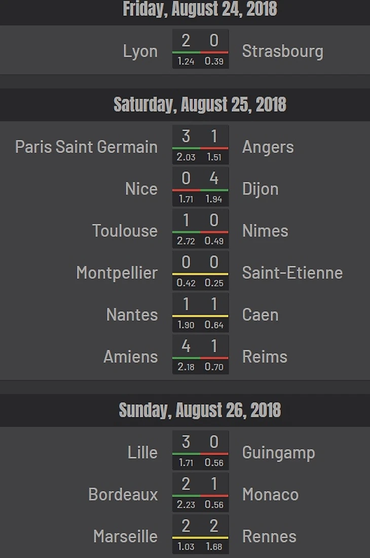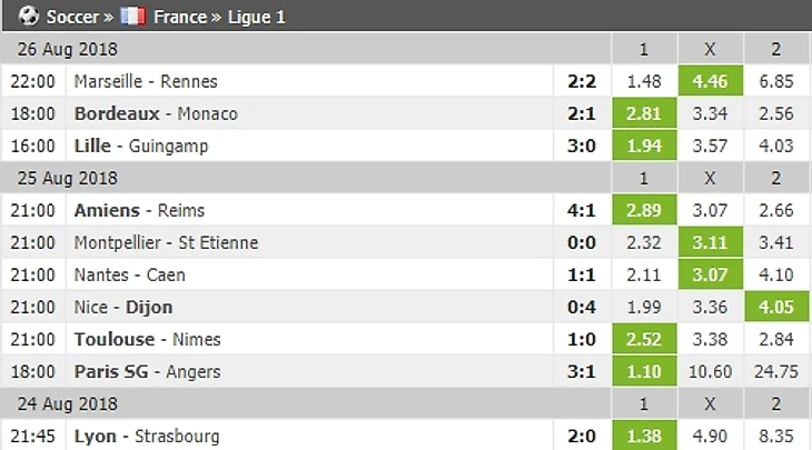 2. Фавориты-андердоги: третий тур подряд андердоги дают бой. Марсель не смог выиграть у Ренна (п1 – 1,48; состоявшаяся ничья – 4,46). Ницца вообще разгромно улетела Дижону 0:4 (п1 – 1,99; п2 – 4,05). Нант не смог выиграть у Кана (п1 – 2,11; X – 3,07), а Монпелье – у Сент-Этьена (п1 – 2,32; X – 3,11). В остальном фавориты всё же справились, ПСЖ обыграл Анже (п1 – 1,10; но фору -2 не пробил – 3:1), Лион обыграл Страсбург (п1 – 1,38), а Лилль – Генгам (п1 – 1,94). Также были 3 игры с равными котировками, там 3 победы одержали хозяева (Тулуза – Ним, Амьен – Реймс, Бордо – Монако).