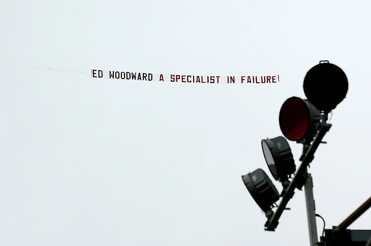 В небе, над стадионом Тэрф Мур, где проводится матч 4 тура Английской Премьер Лиги между Бёрнли и Манчестер Юнайтед, снова кружит самолет с баннером, который гласит: "Эд Вудворд - Специалист по провалам"