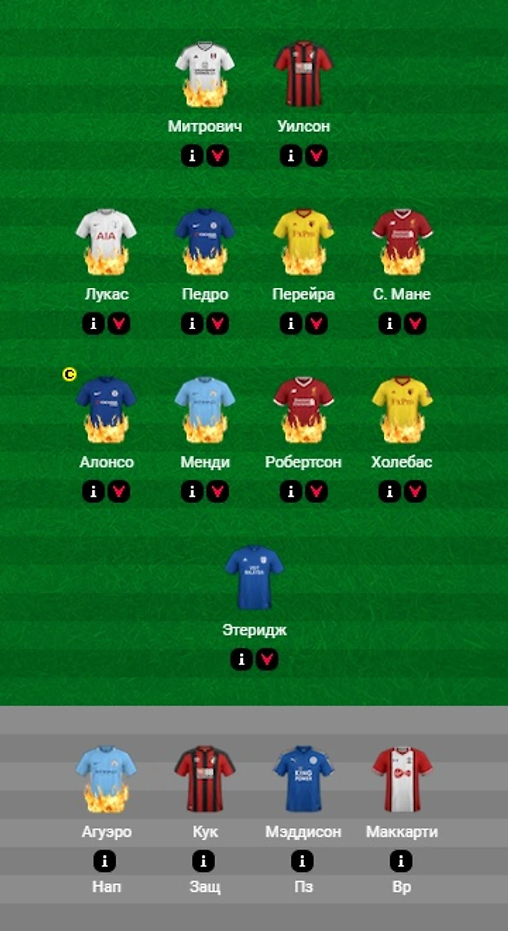 Джокеры на следующие 4 тура. Самый лёгкий календарь, насколько это возможно в Англии у команд Лестер, Борнмут, Арсенал и МЮ, не считая явных фаворитов. Соответсвенно и игроки в первую очередь из этих команд: Уилсон 7,0 и Фрэйзер 6,5, Мэддисон 6,5, Рикарду Перейра 5,5/Магуайр 6,0, Лукаку 8,5, Валенсия 6,5, Ляказетт 8,0, из фаворитов очень мало у кого есть Давид Сильва 8,0.