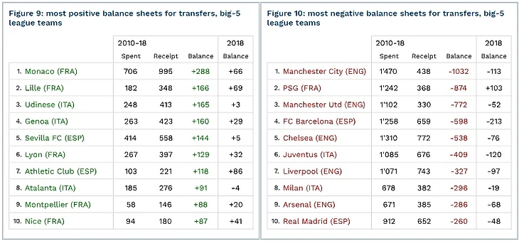 Всего в 2010-2018 годах клубы из топ-5 чемпионатов имели трансферный дефицит 7,3 миллиарда евро.
