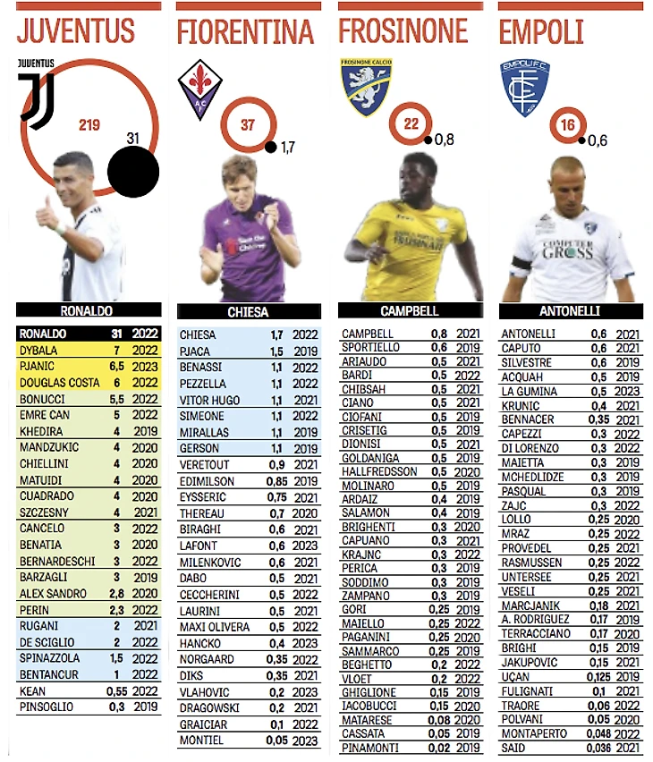 В топ-8 – шесть игроков «Ювентуса» и два представителя «Милана». Зарплатные ведомости этих клубов самые большие – 219 миллионов евро в «Ювентусе» и 140 миллионов евро в «Милане». «Интер» платит 116 миллионов евро, «Рома» - 100 миллионов евро. Самые маленькие зарплаты в «Эмполи» – 16 миллионов евро на 30 футболистов.