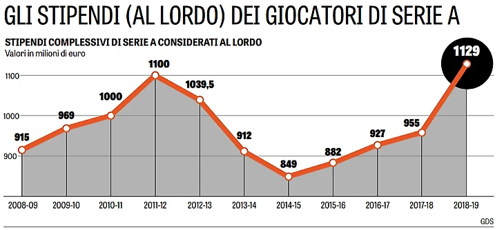 La Gazzetta dello Sport La Gazzetta dello Sport опубликовала ежегодное исследование по зарплатам Серии А. В этом году суммарная зарплатная ведомость лиги составила 1,129 миллиарда евро – это на 200 миллионов евро больше, чем в прошлом году, и на 29 миллионов евро превысило рекордный сезон 2011/12. Рекорд состоялся благодаря Криштиану Роналду, который зарабатывает 31 миллион евро в год.