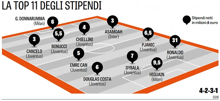 La Gazzetta dello Sport La Gazzetta dello Sport составила сборную самых высокооплачиваемых футболистов лиги по позициям в схеме 4-2-3-1. В команде всего три футболиста представляют не «Ювентус».