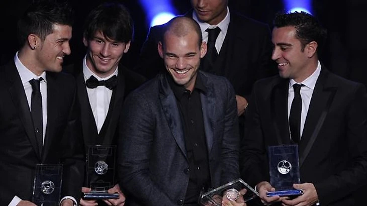 А вот с парой Хави – Иньеста посложнее, мозг и мотор «Барселоны» и сборной Испании, чемпионы мира, именно их сборная переиграла Голландцев в финале, именно Иньеста забил тот победный гол. Хави лучший ассистент Примеры. Вместе с Иньестой они страшная сила и просто убойная связка, но как выбрать одного из них? Со Снейдером проще, он связующее звено «Интера» и сборной Голландии, явный лидер обоих коллективов, звезда и герой двух самых престижных турниров того сезона, вот он, главный претендент. Собрал немалую коллекцию наград за сезон, что всегда играло очень большую роль во время присуждения звания лучшего игрока.