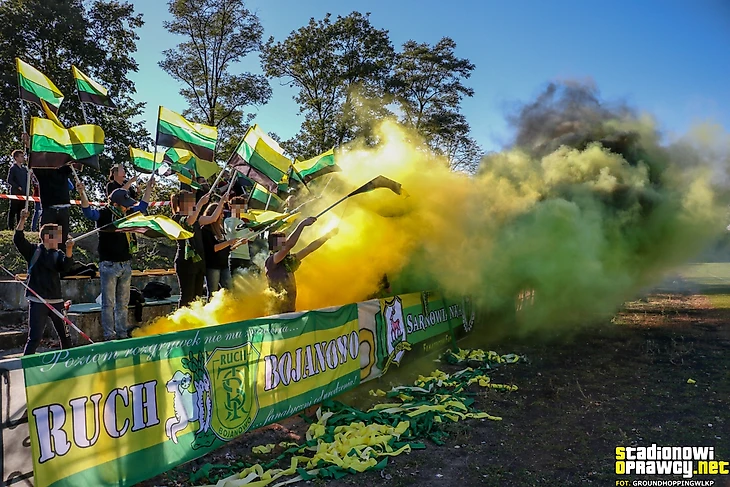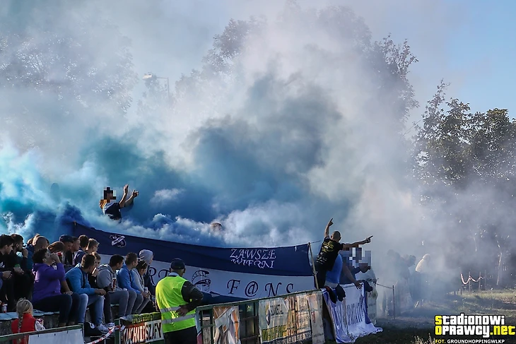 Еще один матч ІІІ лиги. Фанаты «Руха» Радзёнкув с пиро на выезде в Намыслове.