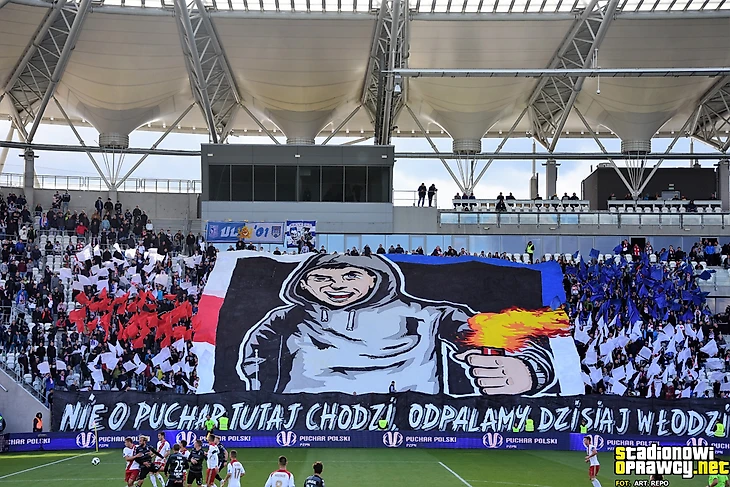 Снова фото из Лодзи. В 1/32 кубка Польши местный «ЛКС» встречался с «Лехом». Не так давно между фанатами из Лодзи и Познани была заключена згода. На матче были подготовлены две оправы.