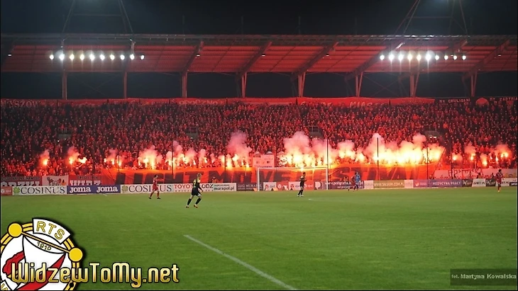Какой же обзор польских трибун без фанатов «Видзева». На матч с «Сяркой» «красные» подготовили перформанс с отсылкой к фестивалю света «Light Move Festival», который проходил в Лодзи в конце сентября.
