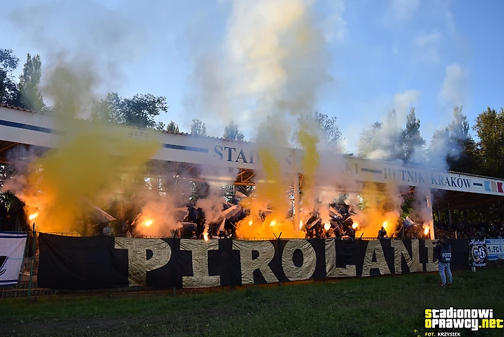 Матч ІІІ лиги краковский «Хутник» против жешувской «Стали». Пиротехника от хозяев с баннером «Piroland».