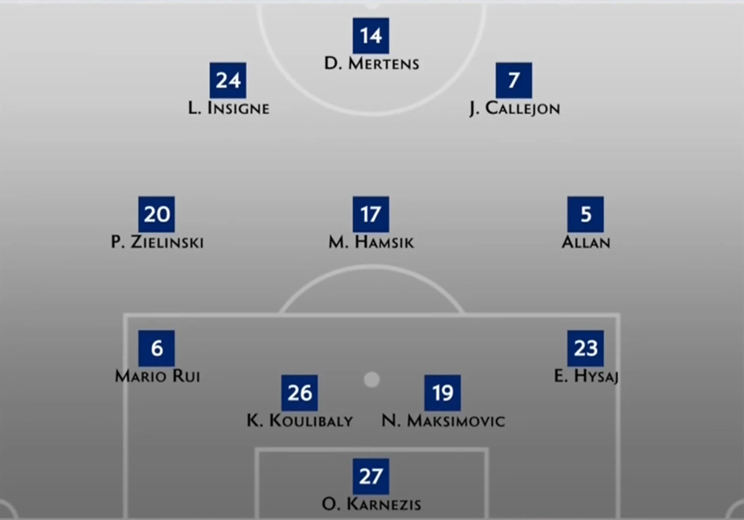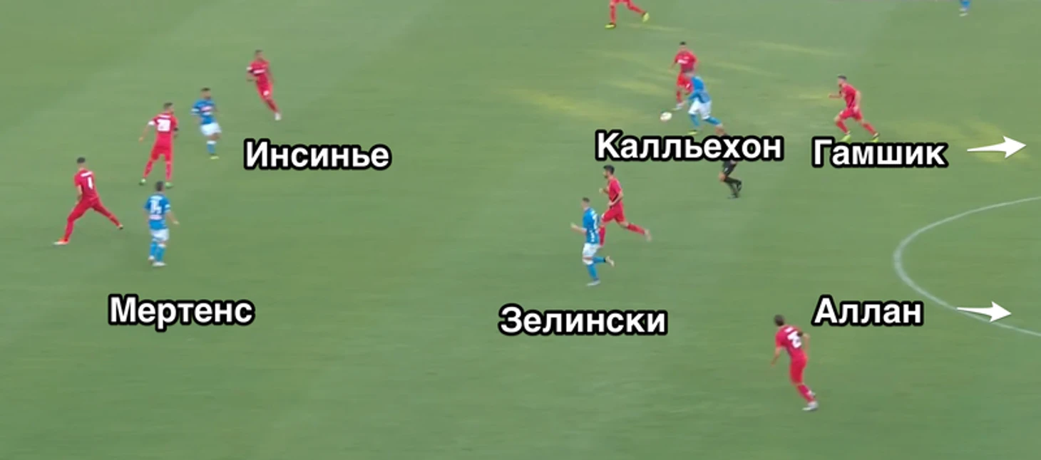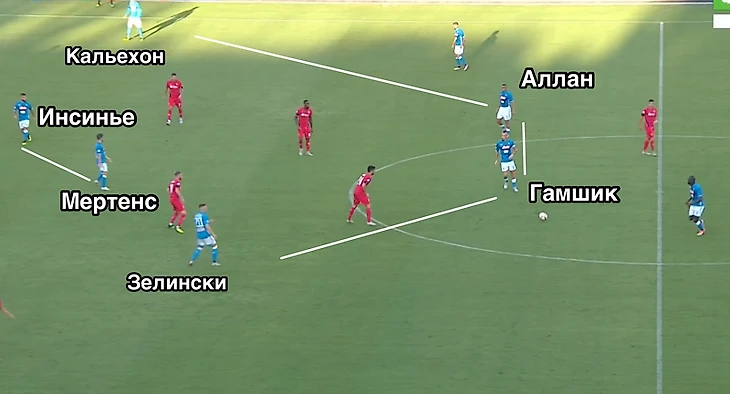 Здесь Карло решил попробовать тот же ход, который когда - то активно применял в ПСЖ: использовал Лавесси в паре с Кавани в центре нападения. Там, кстати, и набор игроков (если закрыть глаза на то, что Мертенс - это Ибрагимович) был очень похож: левым полузащитником был Пасторе, который больше АПЗ по своей сути; правым был Моура; Матюиди/Аллан; Гамшик/Вератти
