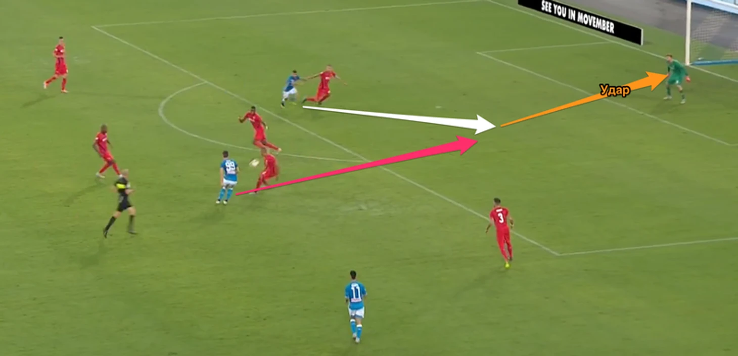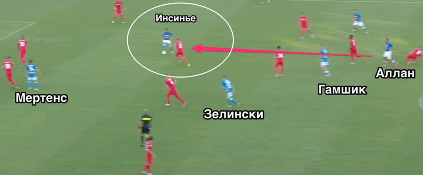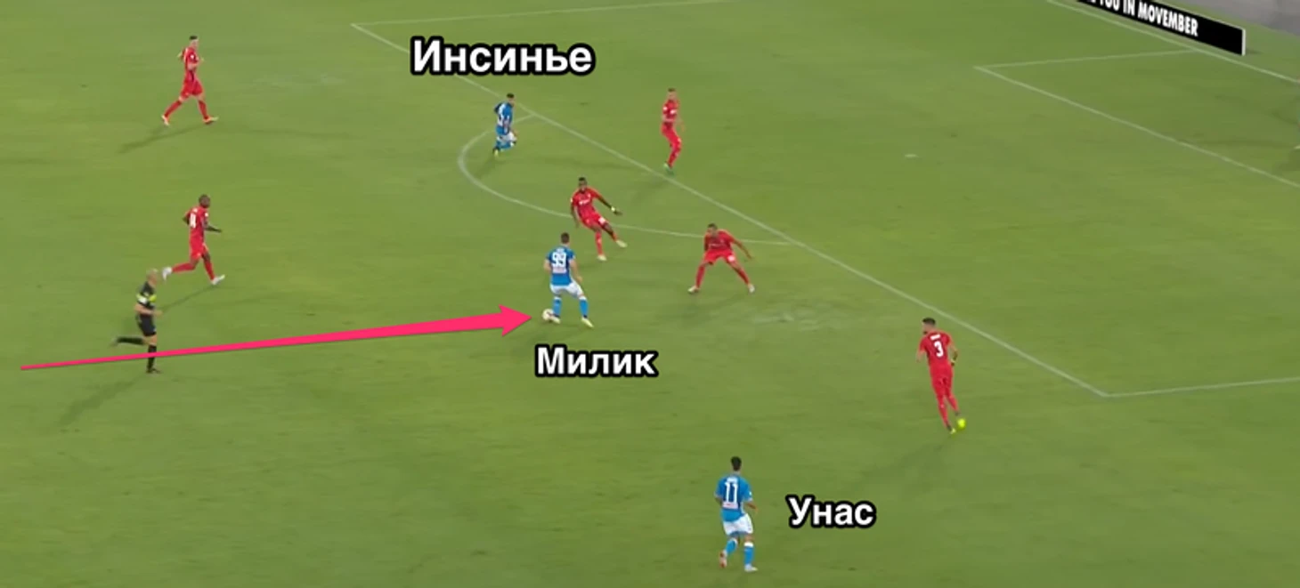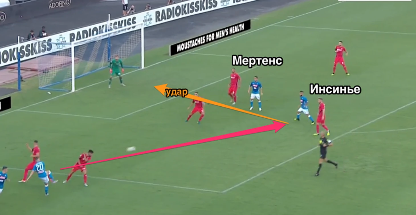 Гамшик хорошо засунул мяч на Милика, а тот прекрасно нашел забегание Инсинье. Хоть пас был и не идеальный, но он нашел своего адресата. Лоренцо очень хладнокровно решил эпизод