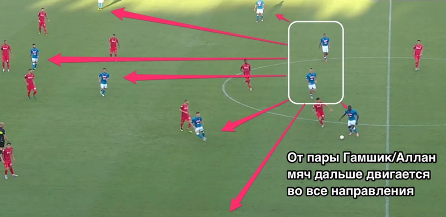 Пока что, в опорную зону отправлен Гамшик, где он классно взаимодействует в паре с Алланом. Вообще, я ждал, что при Карло он станет на место такой себе смещенной левее "десятки", какими были в командах Анчелотти Зеедорф, Лэмпард, Пасторе, Иско...