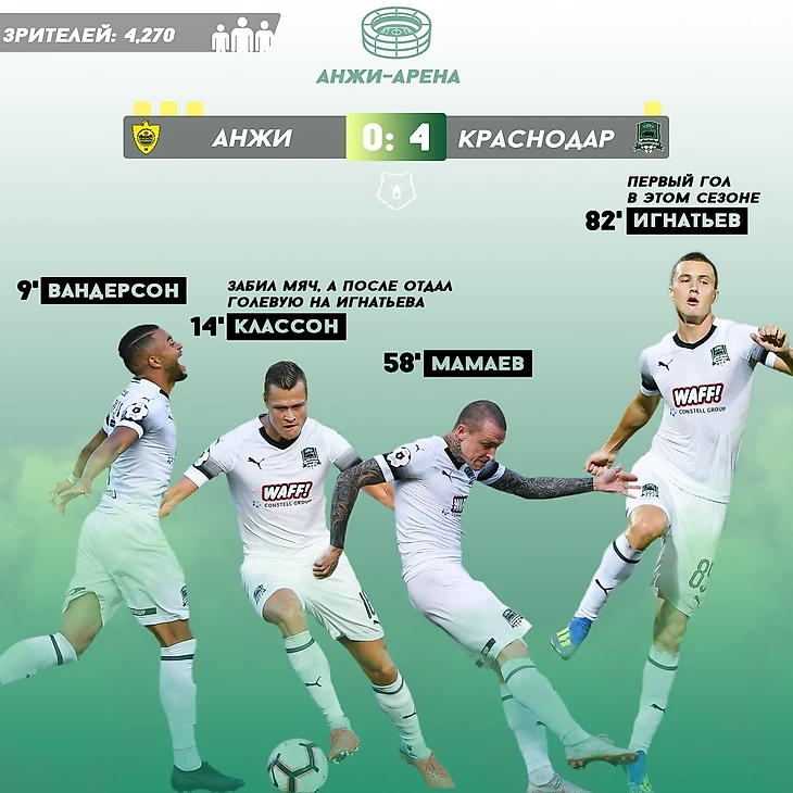 Хуже всех в чемпионате дела обстоят у махачкалинского «Анжи». Последнее место, шесть поражений подряд, четырнадцать пропущенных мячей, теперь ещё и разгром от «Краснодара» на родной арене. Кстати, гол Мамаева рабоной просто прекрасен.