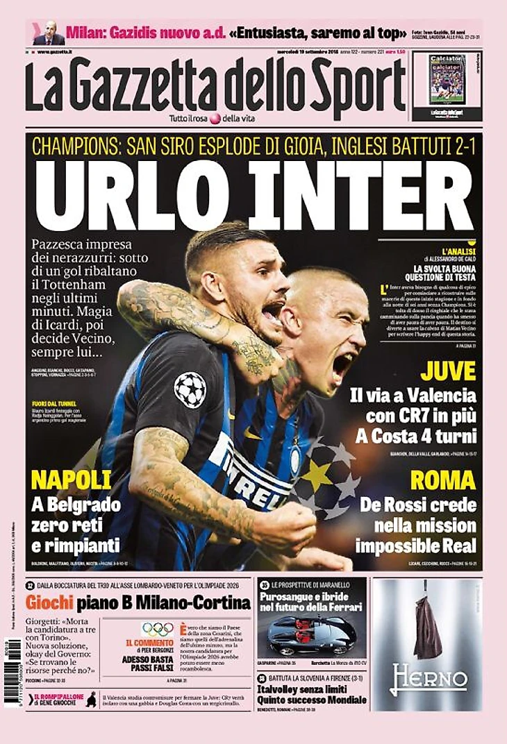 Лига Чемпионов вновь зажигает «Интер»: удивительный камбэк на «Сан Сиро». «Тоттенхэм» побежден 2:1. Замечательный удар с лёта от Икарди и удар головой от Весино на 92 минуте опрокидывают «шпор»: болельщики сходят с ума от радости. Маурито: «Зрелищная ночь». Спаллетти: «Отличные эмоции».