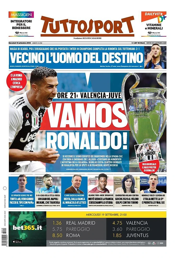 Обе команды в Испании: в Валенсии Роналду представит самый сильный «Юве». В Мадриде Ди Франческо с парой Де Росси-Нзонзи в поисках переворота.