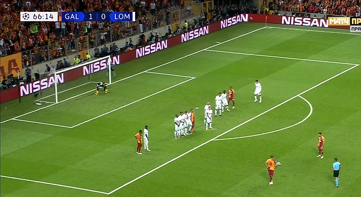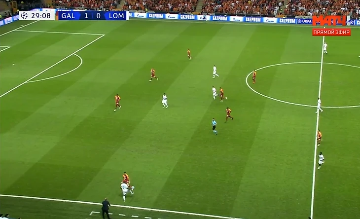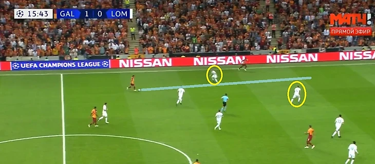 - на линии штрафной 2 игрока Галатасарая и три защитника Локомотива (это нормально и соответствует всем рекомендациям для крайних защитников - не охранять пустой фланг и смещаться к центру создавая численное преимущество в защите)