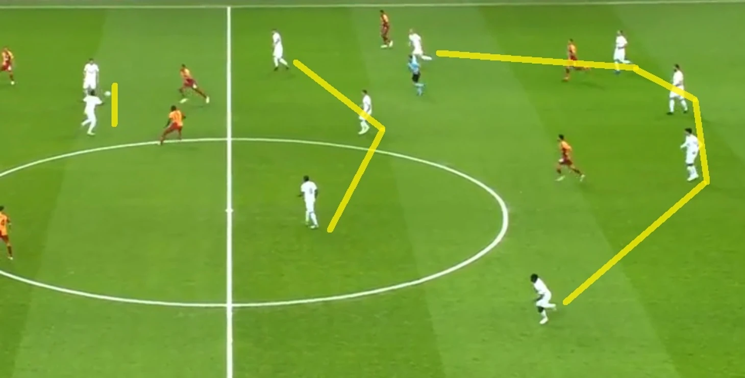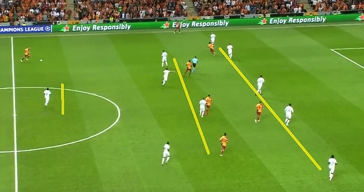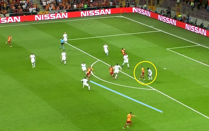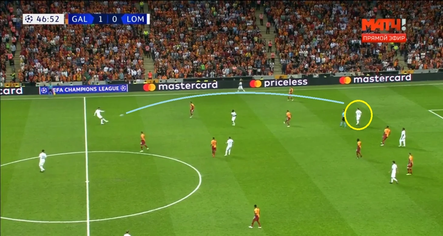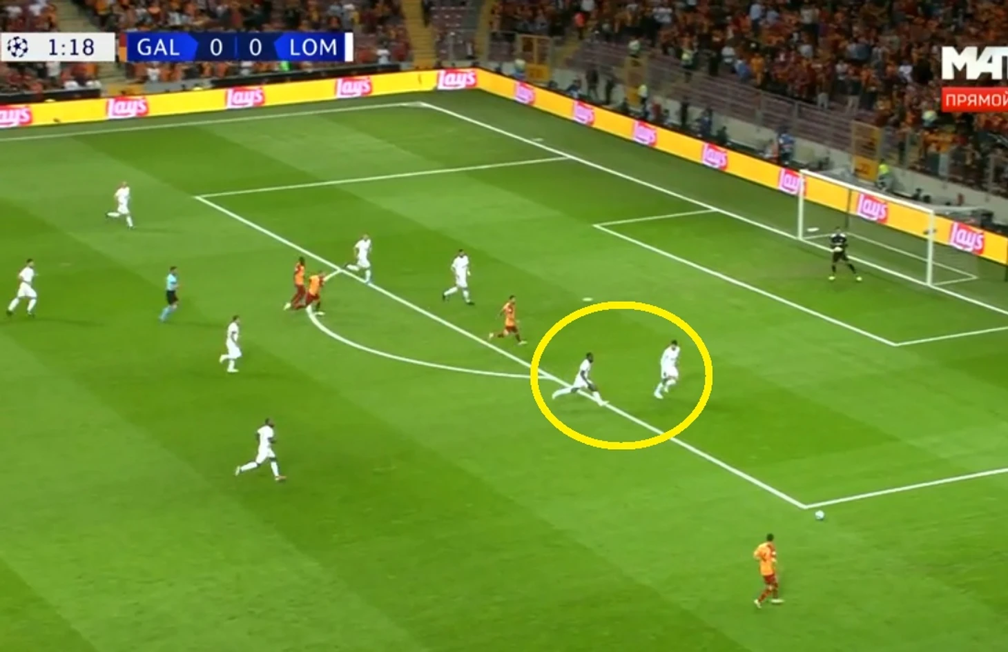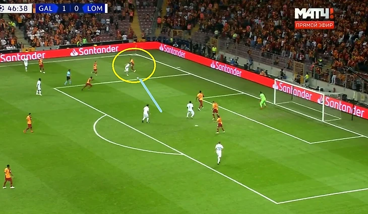 Позиционная ошибка игроков Локомотива вынуждает Идову действовать на позиции центрального защитника, освобождая зону фланговому игроку Галатасарая.
