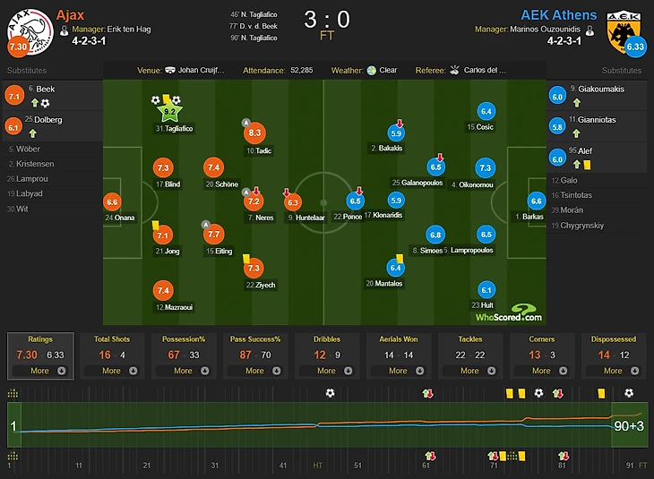 А еще через 10 минут все было разыграно безупречно. Атакующая четверка амстердамцев переиграла оборонительную семерку гостей. Тадич и Зиех запутали на правом полуфланге защитников АЕК, Нерес отвел внимание центрбека и вратаря, еще два грека стянулись к марокканцу. А ван де Бек в одиночку рванул в свободную зону. Отдать точный пас для Тадича – что оливку съесть. Голландец расстреливал ворота с линии вратарской без сопротивления. 2:0.