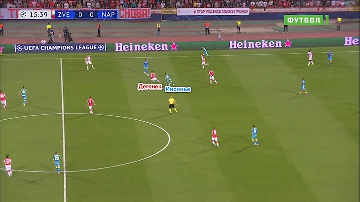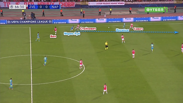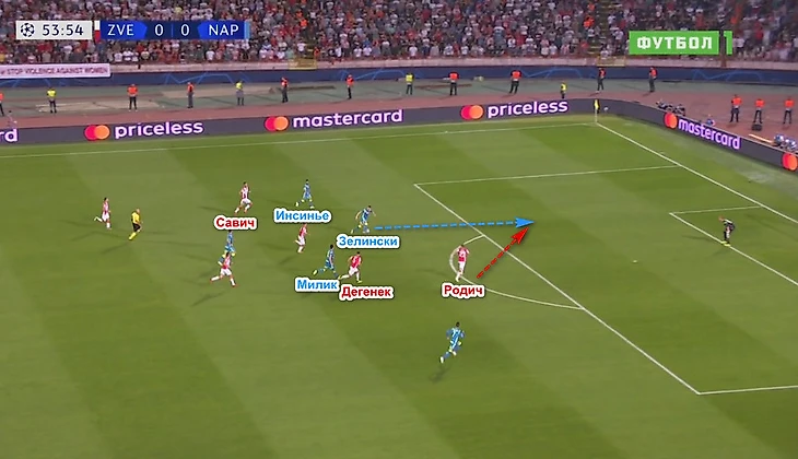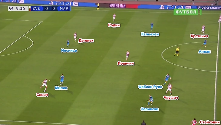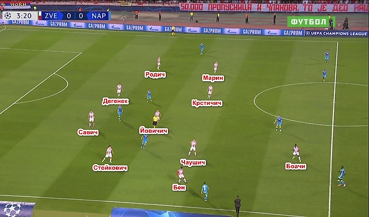Типичная ситуация: «Звезда» разыгрывает штрафной в центре поля и вынуждена играть назад. На Крстичича выбегает Аллан, Ненад отдаёт на Родича, которого уже атакует Кальехон, Милан через атакуемого Инсинье Дегенека на Савича, на которого выходит Милик. Футболисты «Наполи» перекрывают всех адресатов, и Вуядин вынужденно отдаёт длинный заброс на Бена – пас заканчивается перехватом Марио Руя. Вообще в 1 тайме выход из обороны в атаку удавался лучше всего через Марина, благо Марко мог протащить мяч.