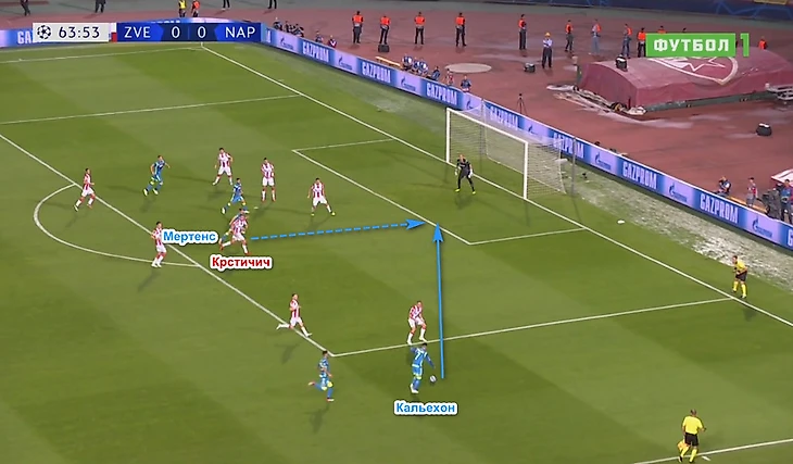 Именно справа и пришёл момент на 64-й минуте, когда Мертенс не забил с вратарской. Крстичич просто не уследил за взрывным бельгийцем.