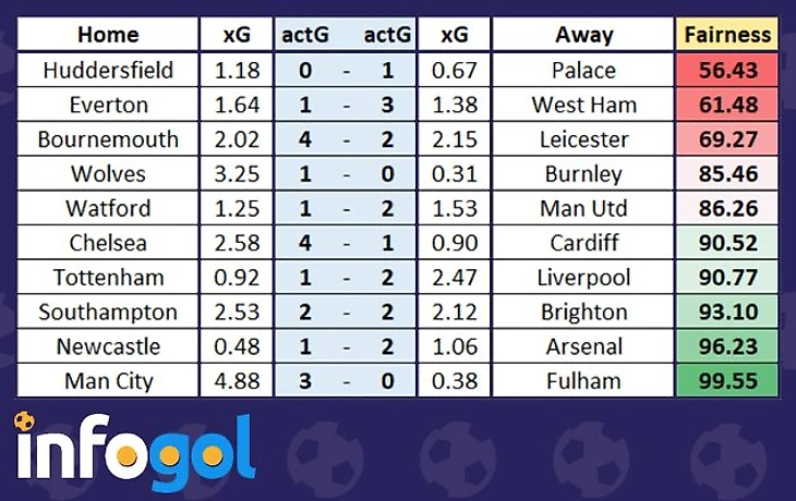 Как видим, самым несправедливым (с точки зрения модели xG) результатом стала гостевая победа "Кристал Пэлас" над "Хаддерсфилдом" со счетом 1-0.