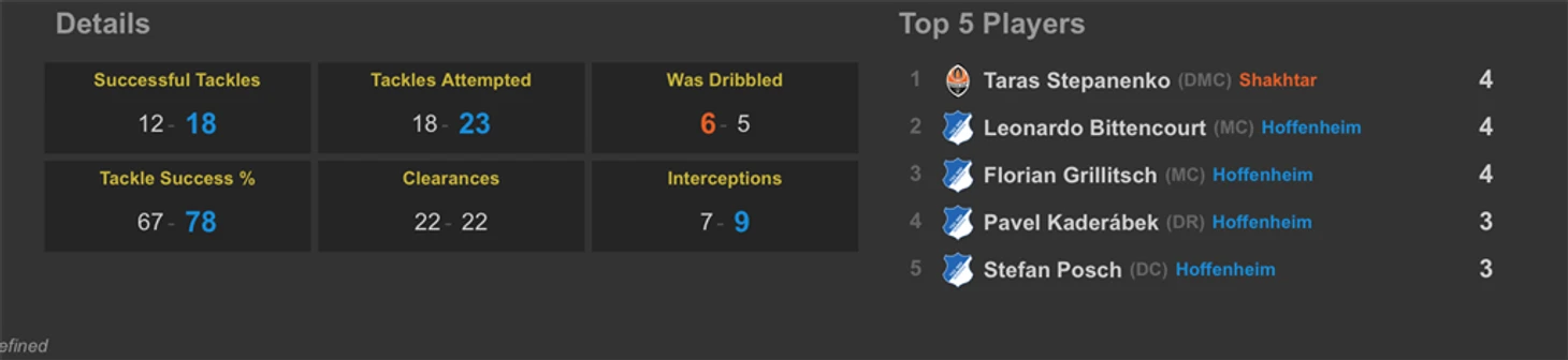 Если у Шахтера только Тарас Степаненко выделился количеством отборов, то у Хоффенхайма целый ряд футболистов набрал 3+ отбора: Биттенкурт (4), Гриллич (4), Кадержабек (3), Пош (3). Если проследить последовательность - это как раз те люди, которым приходилось встречаться на поле с самыми ядерными футболистами Шахтера: Тайсон, Маралос, Исмаили. На карте успешных отборов, конечно же, видно, что больше всего отборов было на левом фланге, где воевали Тайсон и Исмаили