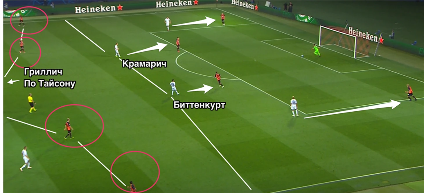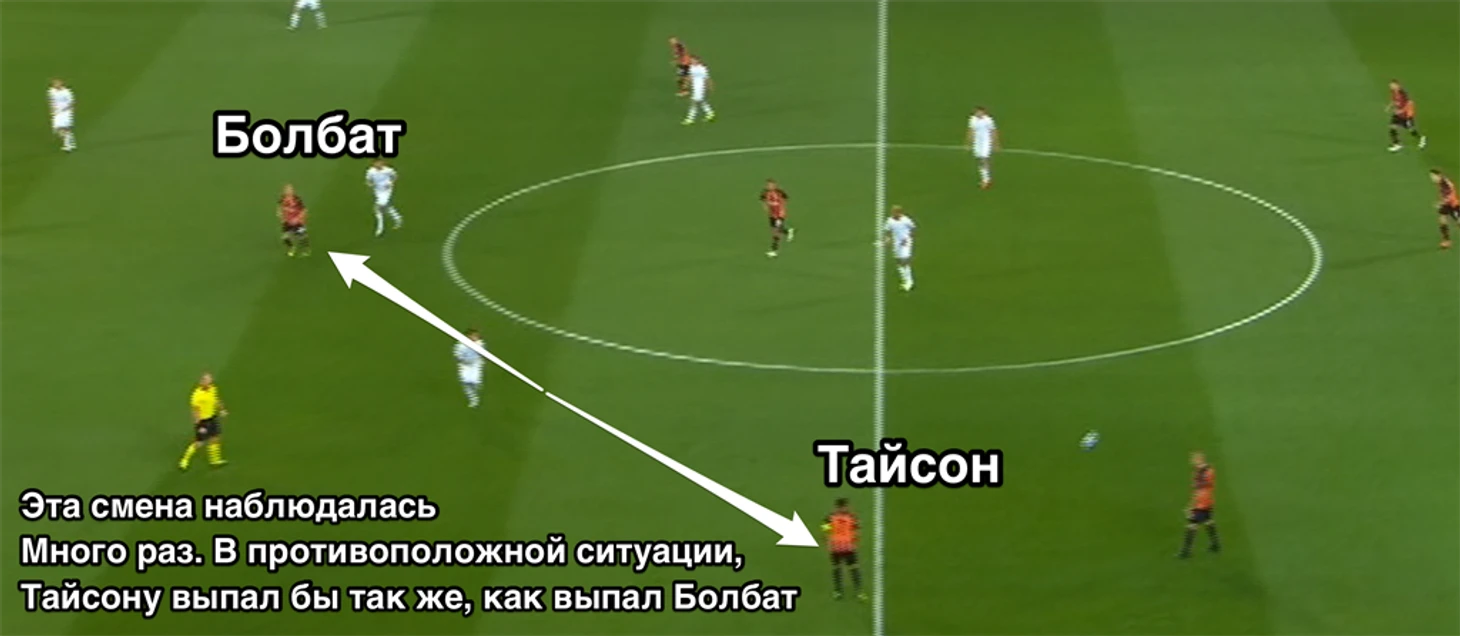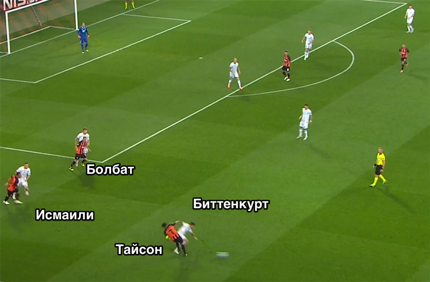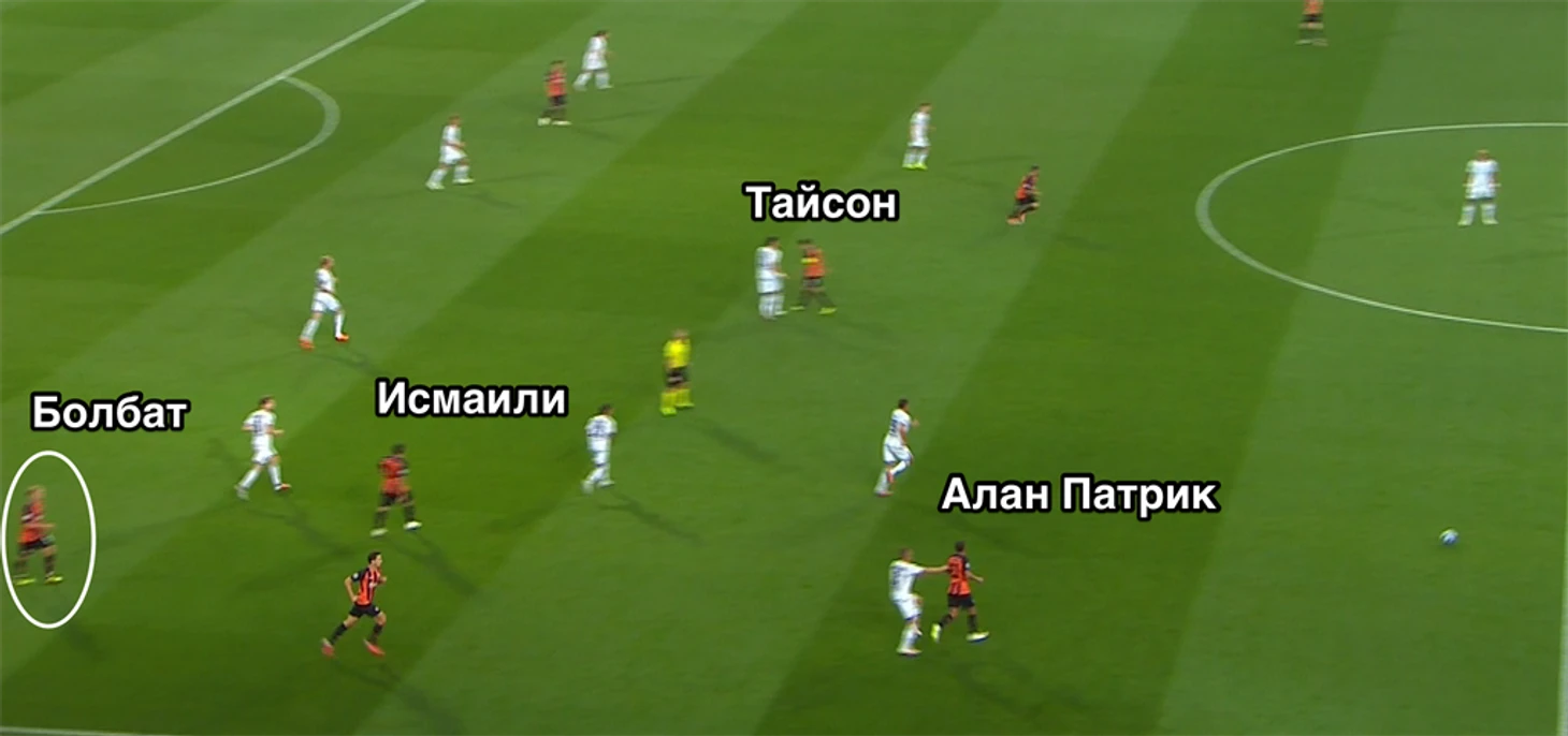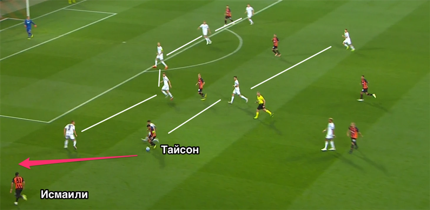 Шахтер был прилично так загнан в левый фланг, где ощущался явный перевес Исмаили над Бутко в плане атакующего потенциала. Да и Тайсон, номинально играющий центрального атакующего полузащитника (до ухода Болбата), очень часто уходил именно ближе к левому флангу. А после выхода Коваленко, он там вообще уверенно поселился. Кстати, в паре с Исмаили у него получилось очень достойно повозить Кадержабека.