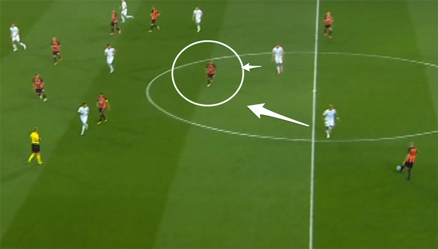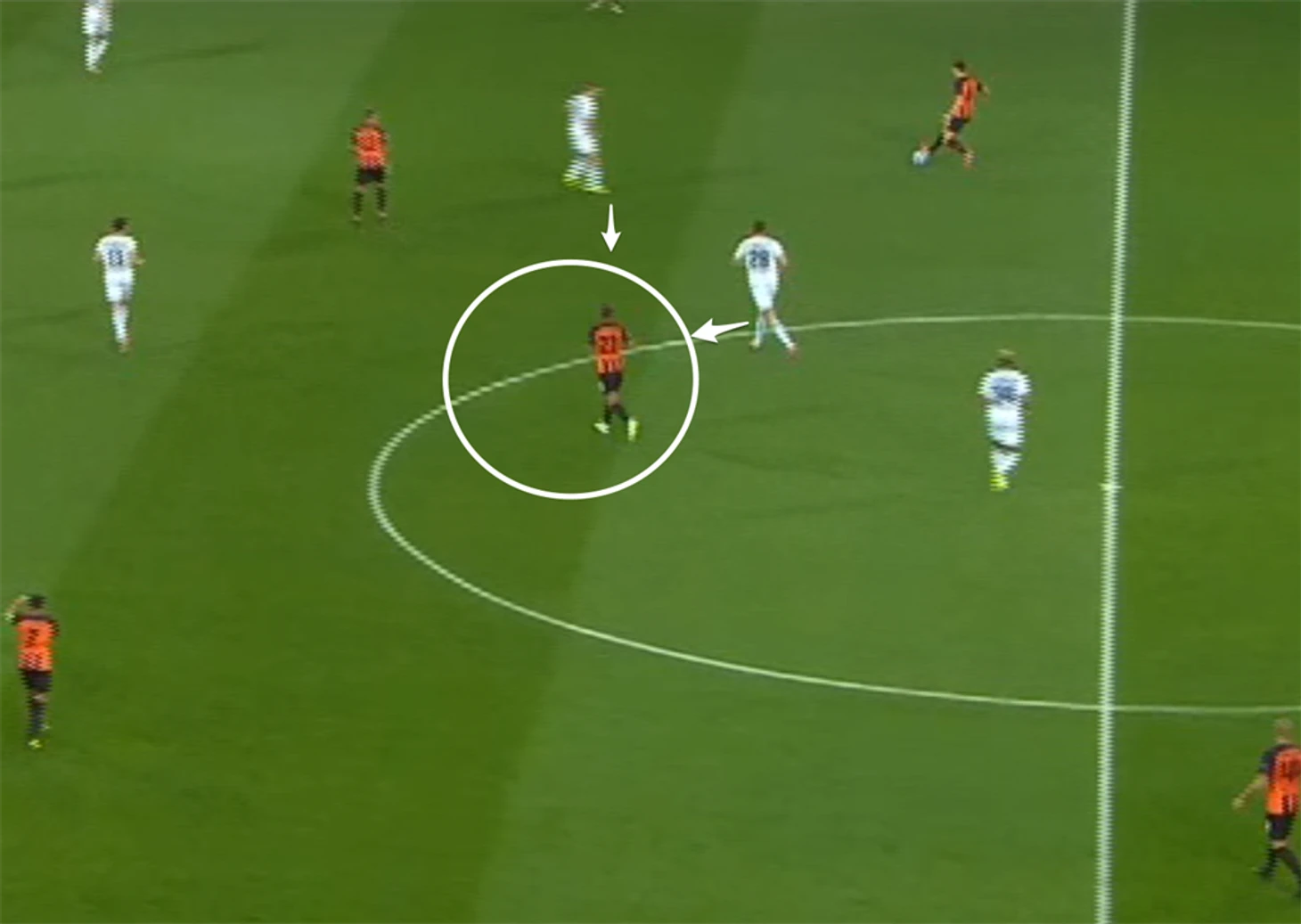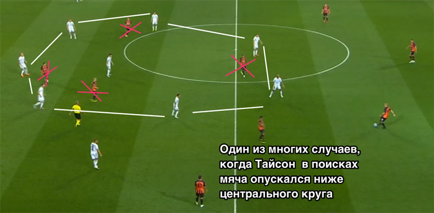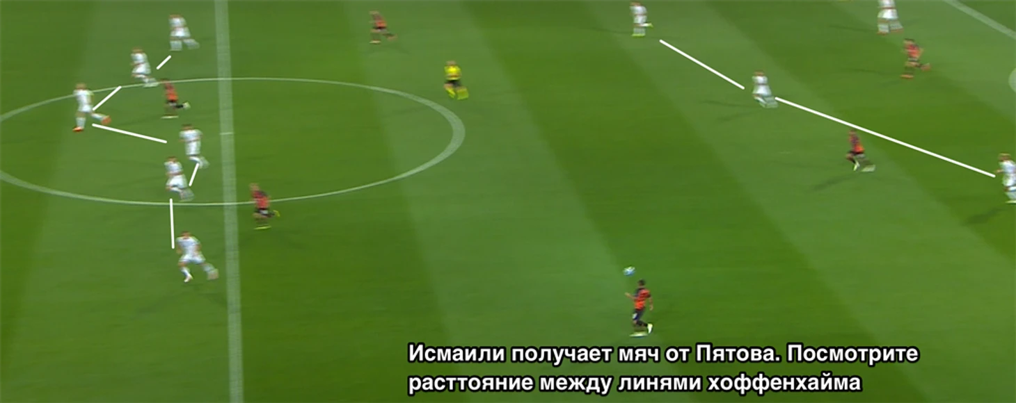 Даже на таком кадре видно, на сколько большим становился разрыв в линиях между игроками Хоффенхайма. По сути, сразу четыре игрока Шахтера оказывались между линями соперника. Болбат/Тайсон, Маралос, Бутко, Исмаили имели возможность практически свободно получать мяч от Пятова и дальше разворачивать атаку, уже имея минус четыре соперника за спиной.