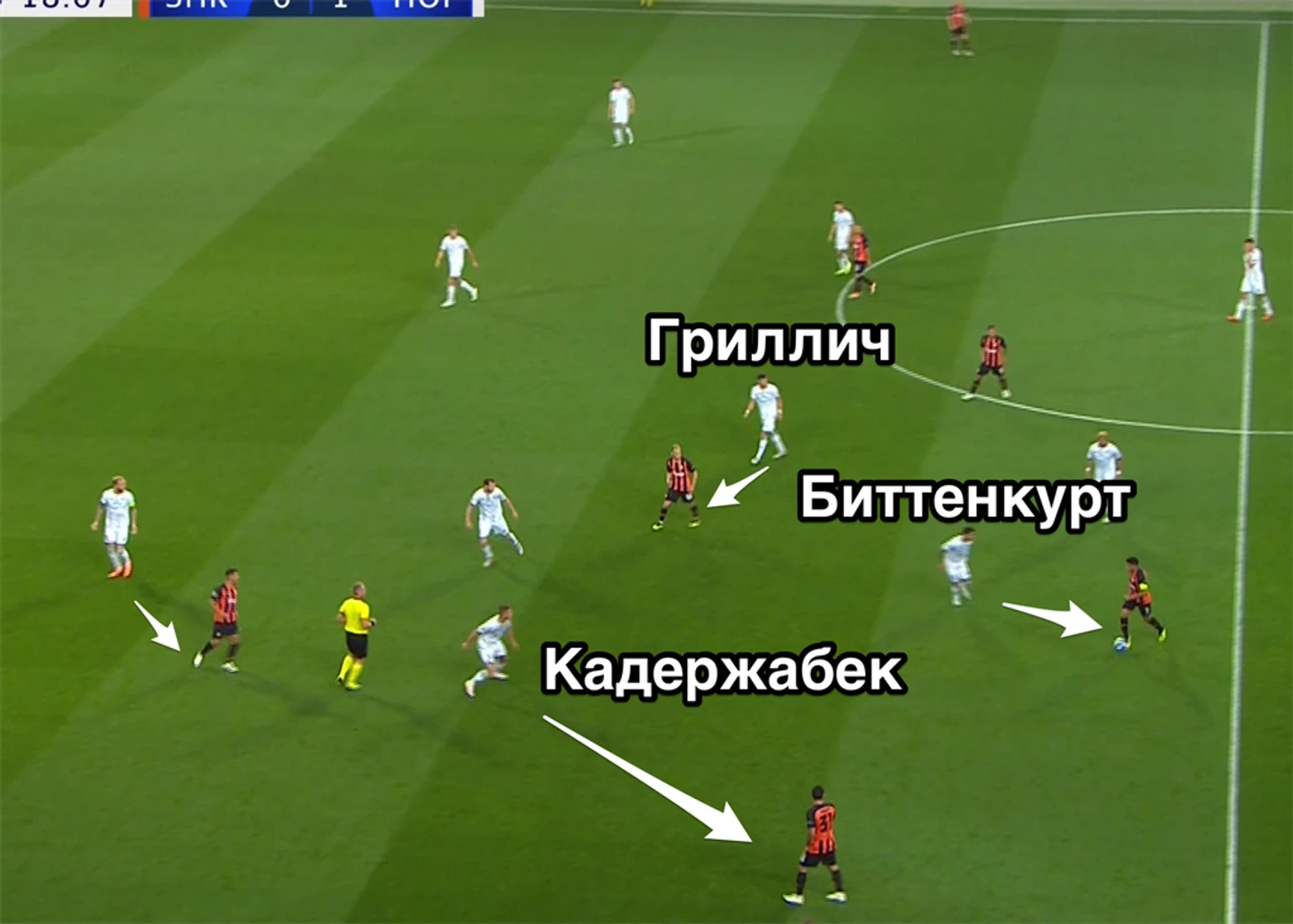 Вот в чем иногда провисали защитники Нагельсмана, так это в эпизодах слишком широкого расположения вингеров Шахтера. Запомнился эпизод, когда Болбат по флангу залез в тыл соперника, а Кадержабек пошел играть с оказавшимся слева Аланом Патриком