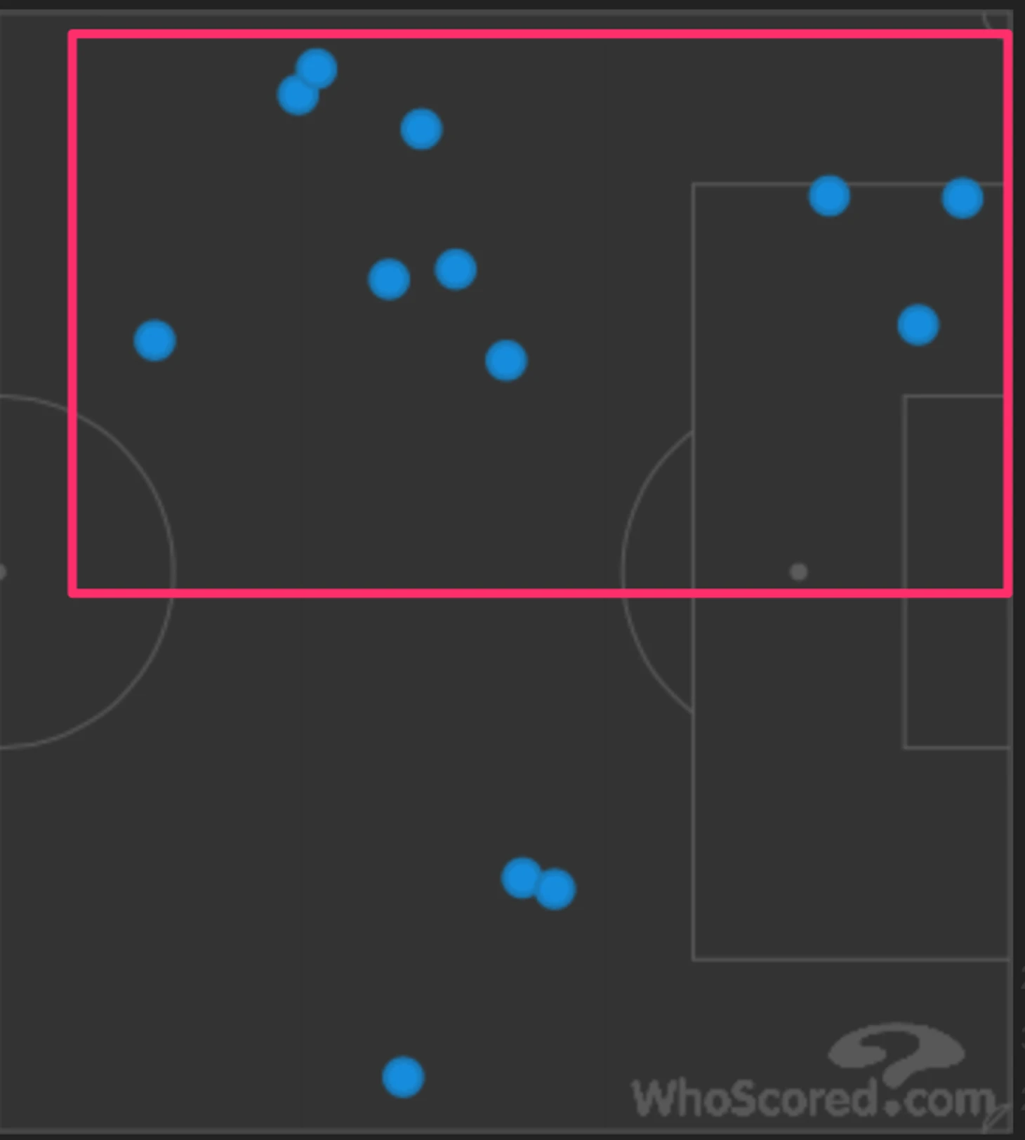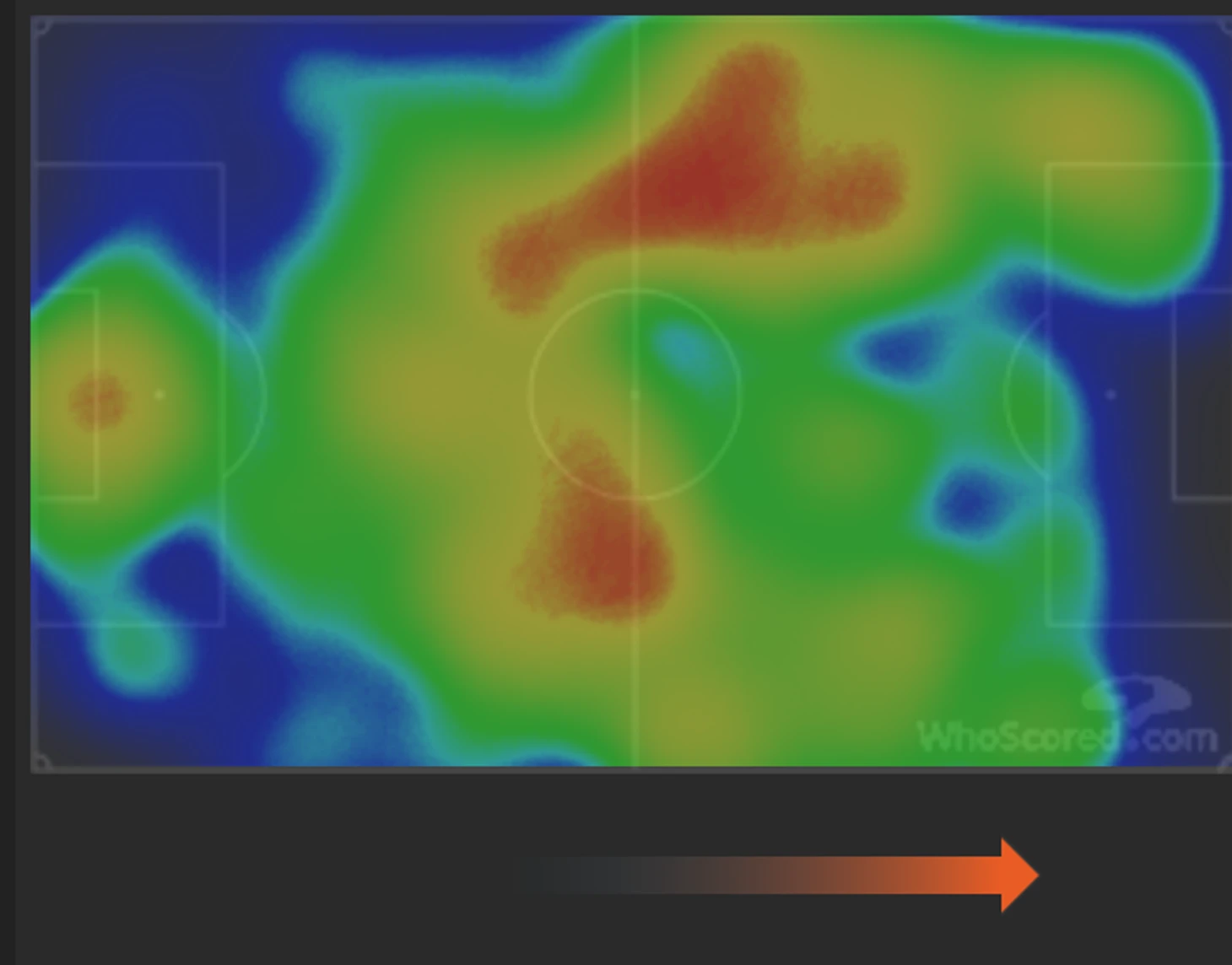 Такой замок в центре привел к тому, что Шахтер вообще ничего не создал через центр поля, а Марлос и Тайсон раз за разом опускались в зону центрального круга для встречи с мячом. Про Болбата вообще мало чего можно сказать по этому матчу - он с него просто выпал. На тепловой карте касаний Шахтера хорошо видно практически полное отсутствие атакующих действий в центральной части поля.
