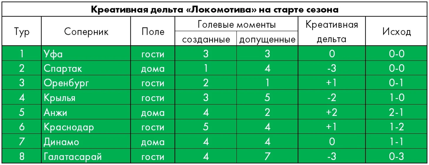 Как итог – 7 допущенных моментов при трёх «явных» у своих ворот (антирекорд текущего сезона) и вполне заслуженное крупное поражение «Локо». В рамках чемпионата столь масштабных провалов в защите пока не случалось, но и говорить о какой-то сверхнадежности не приходится. Текущий средний показатель 3,75 допущенных моментов за игру - это почти на треть больше, чем в чемпионском сезоне (2,87), так что команда Сёмина вполне закономерно зависла в середине турнирной таблицы.